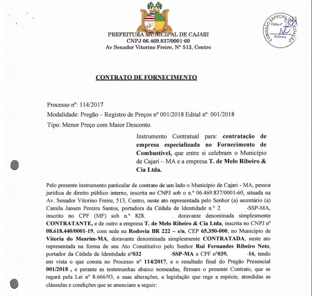 Por meio de um servidor, que não foi identificado para não sofrer retaliações, o blog do Antônio Martins recebeu a denúncia de que a prefeita Camyla Jansen (PSDB) realizou a compra de combustíveis “por baixo dos panos” através do Pregão — Registro de Preços n° 001/2018 e que o posto que venceu o processo é de propriedade do empresário Rui Fernandes Ribeiro Neto, que seria filho da ex-prefeita de Lago da Pedra, Maura Jorge, com o ex-prefeito de Arari, Rui Fernandes Ribeiro Filho.