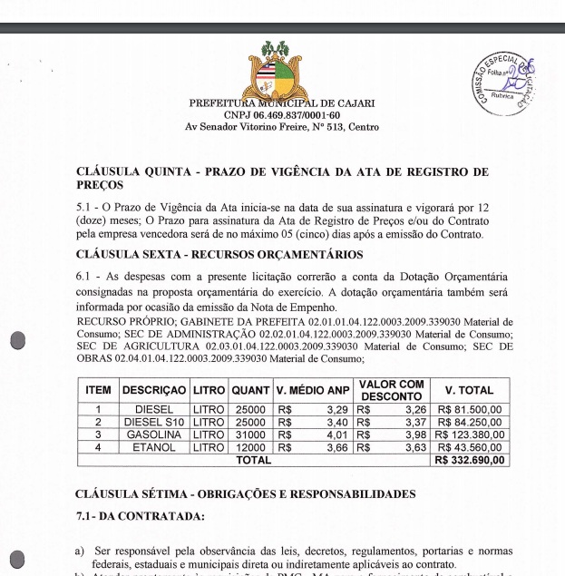 Após a denúncia, o blog do Antônio Martins comparou os preços e constatou que em Vitoria do Mearim, onde os carros oficiais de Cajari são abastecidos, o combustível é mais caro. De acordo com o contrato ao qual tivemos acesso, na época em que assinou a proposta, em janeiro de 2018, o litro era cobrado a R$ 4,01, que com desconto ficou em R$ 3,98, praticamente o mesmo valor praticado hoje, um ano depois da assinatura para fornecimento do serviço.