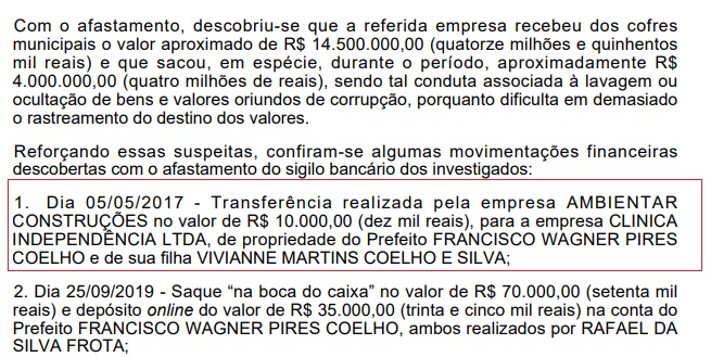 A clínica Independência LTDA, apontada pelos investigadores do GAECO/PI como de propriedade do prefeito afastado de Uruçuí-PI Dr. Wagner e da filha deputada maranhense Vivianne Coelho, também recebeu repasse da Ambientar Construções, responsável pela coleta do lixo no município. O valor da ordem de R$ 10 mil, foi efetuado no dia 05 de maio de 2017, conforme documento ao qual o blog do Antônio Martins teve acesso.