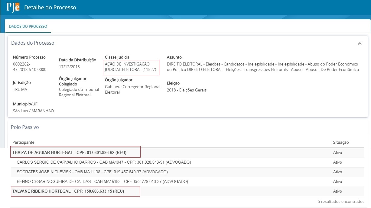 O blog apurou que Victor Mendes pede a cassação do diploma da parlamentar por prática de abuso de poder econômico e captação e gasto ilícito de recursos. Dra. Thaiza é esposa do prefeito de Pinheiro, Luciano Genésio (PP). Além dela, o médico Talvane Ribeiro Hortegal, vice-prefeito de Chapadinha que é pai da denunciada, também figura no polo passivo.