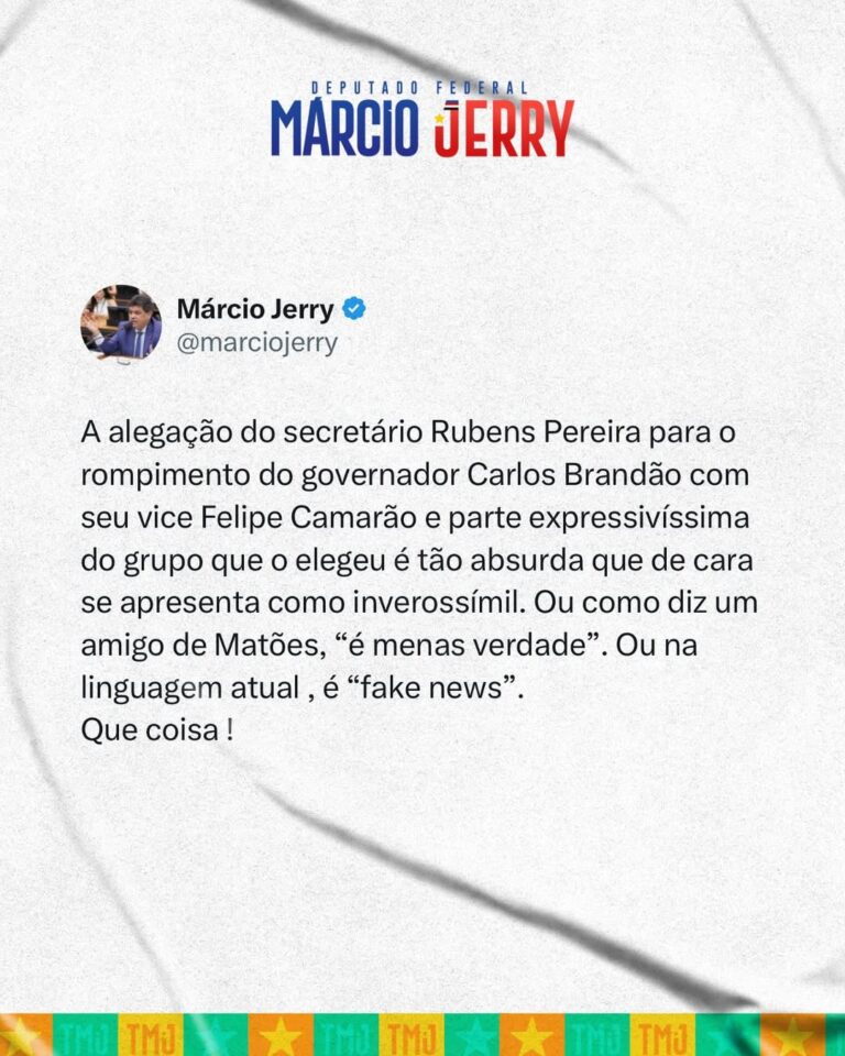 O deputado federal Márcio Jerry reagiu neste sábado (28) às declarações do secretário de Articulação Política (Secap) do Maranhão, Rubens Pereira, sobre o rompimento entre o governador Carlos Brandão e o vice-governador Felipe Camarão.