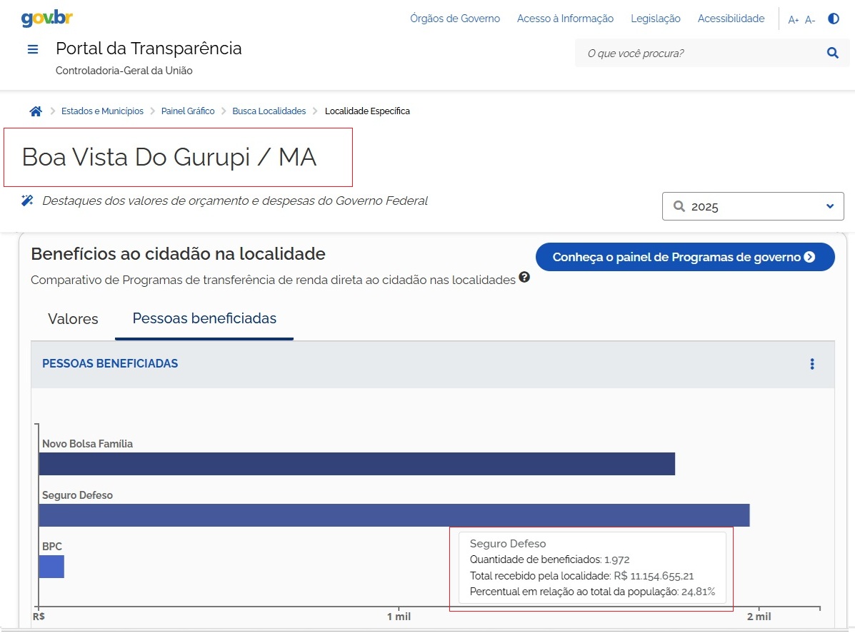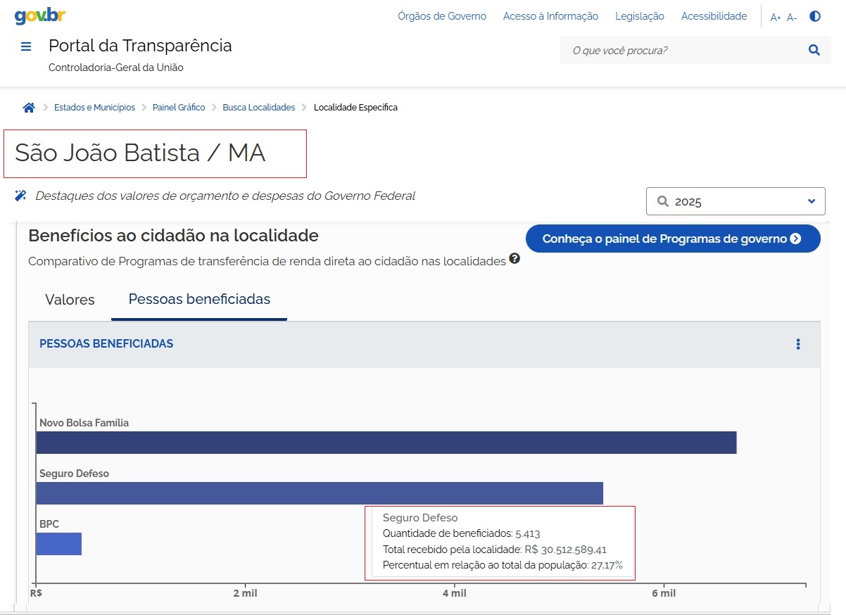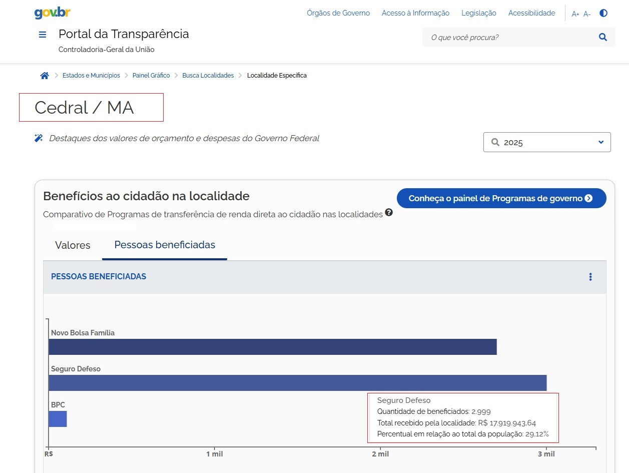 Em Cedral, 2.999 pessoas foram beneficiadas pelo seguro-defeso, totalizando R$ 17.919.943,64. Por outro lado, o Bolsa Família atendeu 2.698 beneficiários, com um montante de R$ 8.891.753,00.