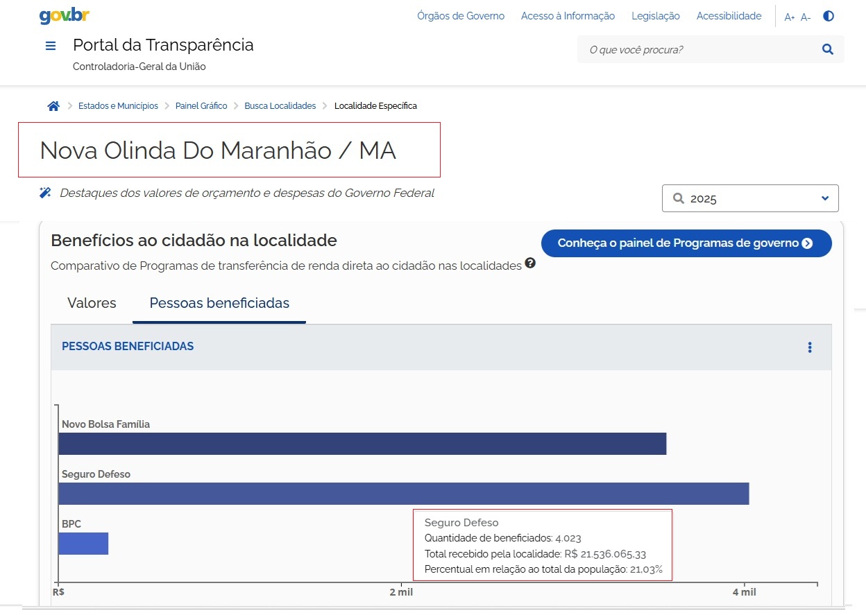 Por fim, em Nova Olinda do Maranhão, 3.541 pessoas são beneficiárias do Bolsa Família, recebendo um montante total de R$ 12.422.644,00. Em contrapartida, o seguro-defeso é concedido a 4.023 pessoas, somando um total de R$ 21.536.065,33.