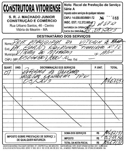 As notas emitidas pela empreiteira que tem sede em um açougue, para a prefeitura de Vitória do Mearim, foram emitidas no dia 28 de março e 17 de abril de 2013, conforme documentos em anexo.