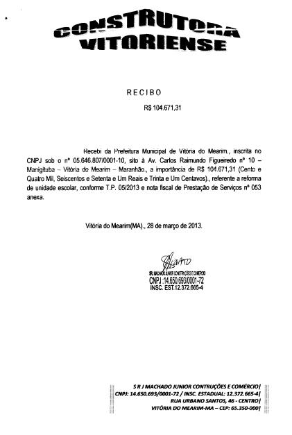 Novos documentos a que tivemos acesso revelam a destinação suspeita dos recursos públicos na administração vitoriense. De posse do relatório de despesas apresentado pela prefeita Dóris ao Tribunal de Contas do Estado (TCE) do Maranhão, no ano passado, o BLOG conseguiu identificar duas notas com valores de R$ 104.671,31 reais e R$ 105.591,79 da Construtora Vitoriense cuja razão social é S R J Machado Junior Construção e Comércio.