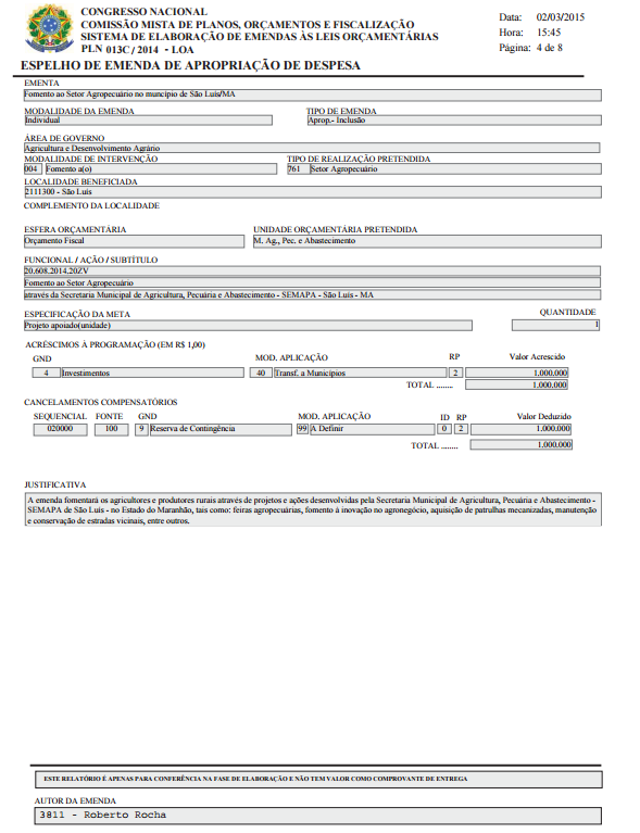 Além de destinar Um milhão para secretaria de Agricultura, Roberto Rocha também destinou Um milhão e Meio para o esporte(conforme espelho abaixo).