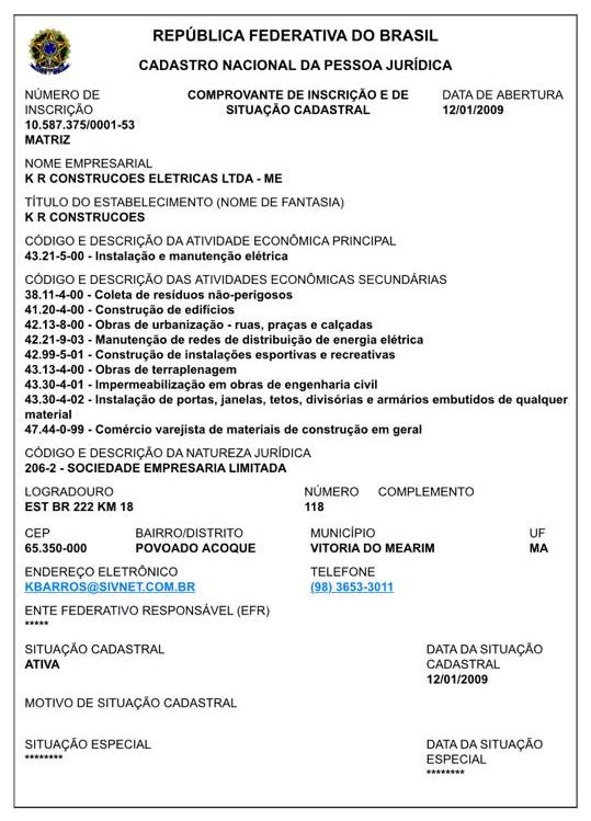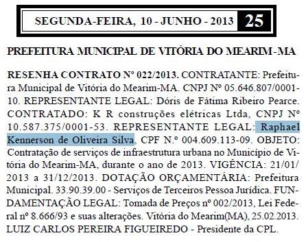 A empresa em questão é a K R Construções Elétricas Ltda, com sede no povoado Acoque, em Vitória do Mearim, cujo representante legal é Raphael Kennerson de Oliveira Silva. O valor do contrato não foi divulgado no Extrato do Diário Oficial. No entanto, ainda essa semana, vamos divulgar as notas que revelam a prestação do serviço.