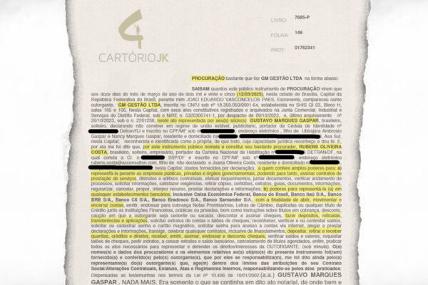A procuração, obtida pela coluna, permite que Rubens Oliveira, responsável por levar a propina a autoridades e políticos envolvidos na Farra do INSS, movimente e saque valores das contas de uma empresa de Gustavo Gaspar, a GM Gestão Ltda.