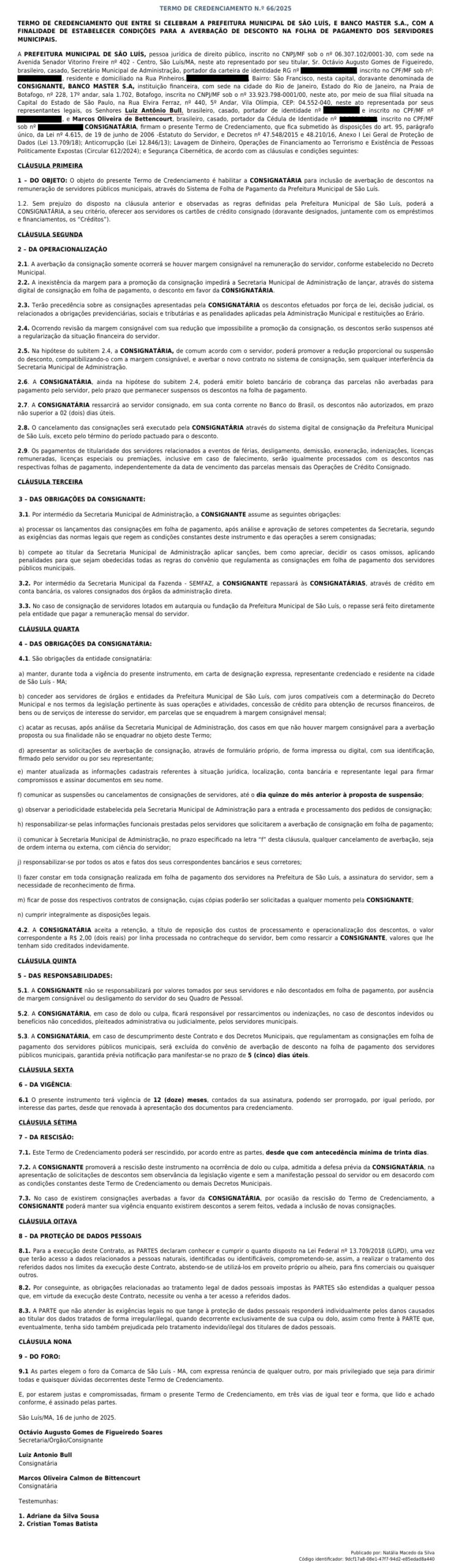 De acordo com as informações, o termo de credenciamento, assinado em 16 de junho do ano passado durante a administração do prefeito Eduardo Braide (PSD), foi endossado pelo secretário Municipal de Administração, Octávio Augusto Gomes de Figueiredo Soares.