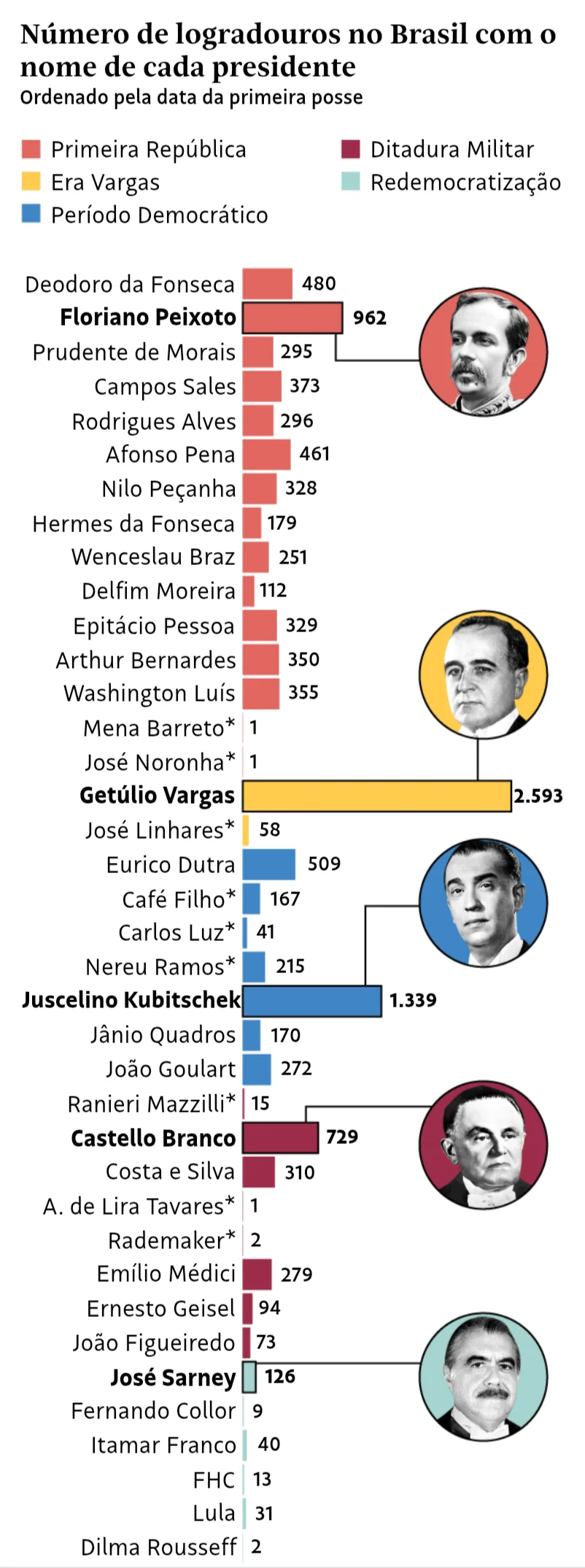A reportagem utilizou a Base de Faces de Logradouros do IBGE, atualizada para o Censo 2022, para chegar a todos os nomes de endereços únicos no Brasil por meio da linguagem de programação Python. A partir do resultado, foi feito o cruzamento com a lista de todos os presidentes que ocuparam o cargo, ainda que interinamente ou em juntas.