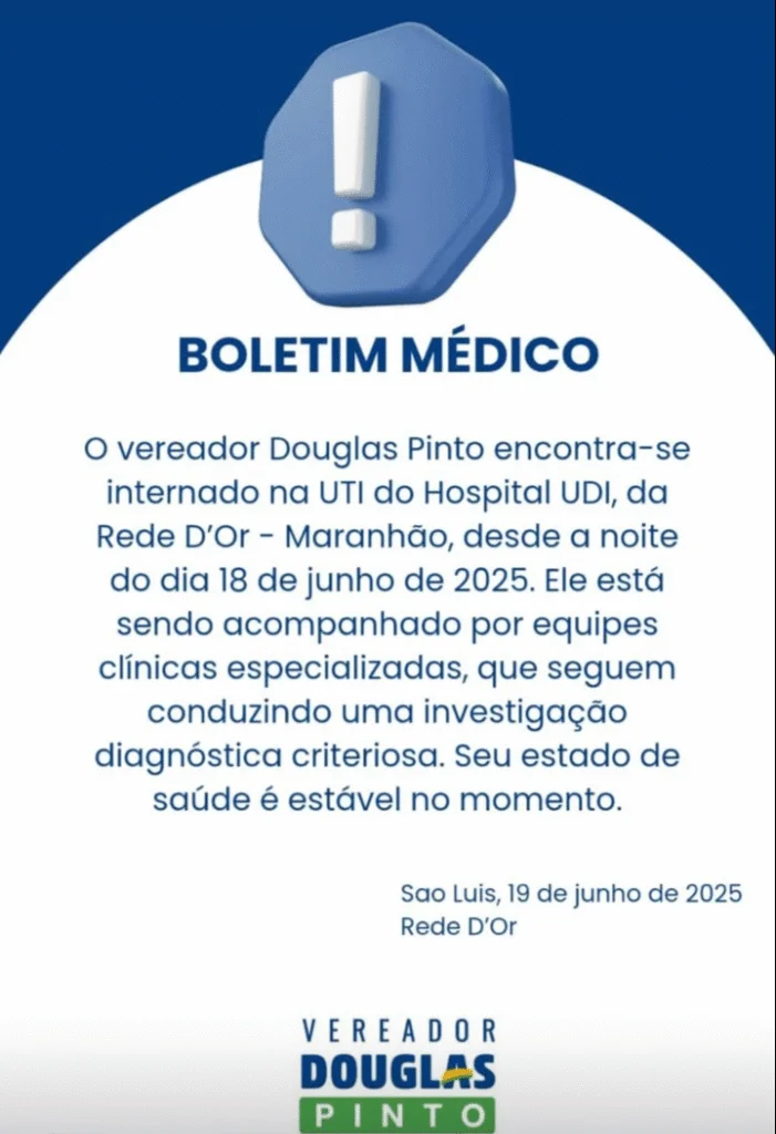 O vereador de São Luís, Douglas Pinto, está internado na Unidade de Terapia Intensiva (UTI) do Hospital UDI, da Rede D’Or, desde a noite de quarta (18). A informação foi confirmada por meio de boletim médico divulgado na quinta-feira, 19.